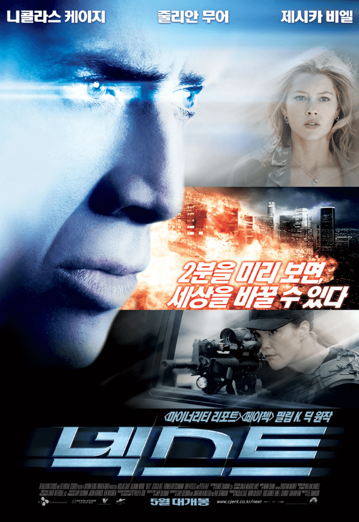 영화 <넥스트>는 2007년 개봉한 미국의 초능력 액션 영화입니다. 니콜라스 케이지, 줄리안 무어, 제시카 비엘 배우가 출연하였으며, 대한민국에서는 총 46만 명의 관객을 모은 영화입니다. 니콜라스 케이지는 2분 후의 미래를 볼 수 있는 라스베이거스의 마술사 크리스 존슨을 연기하였습니다.